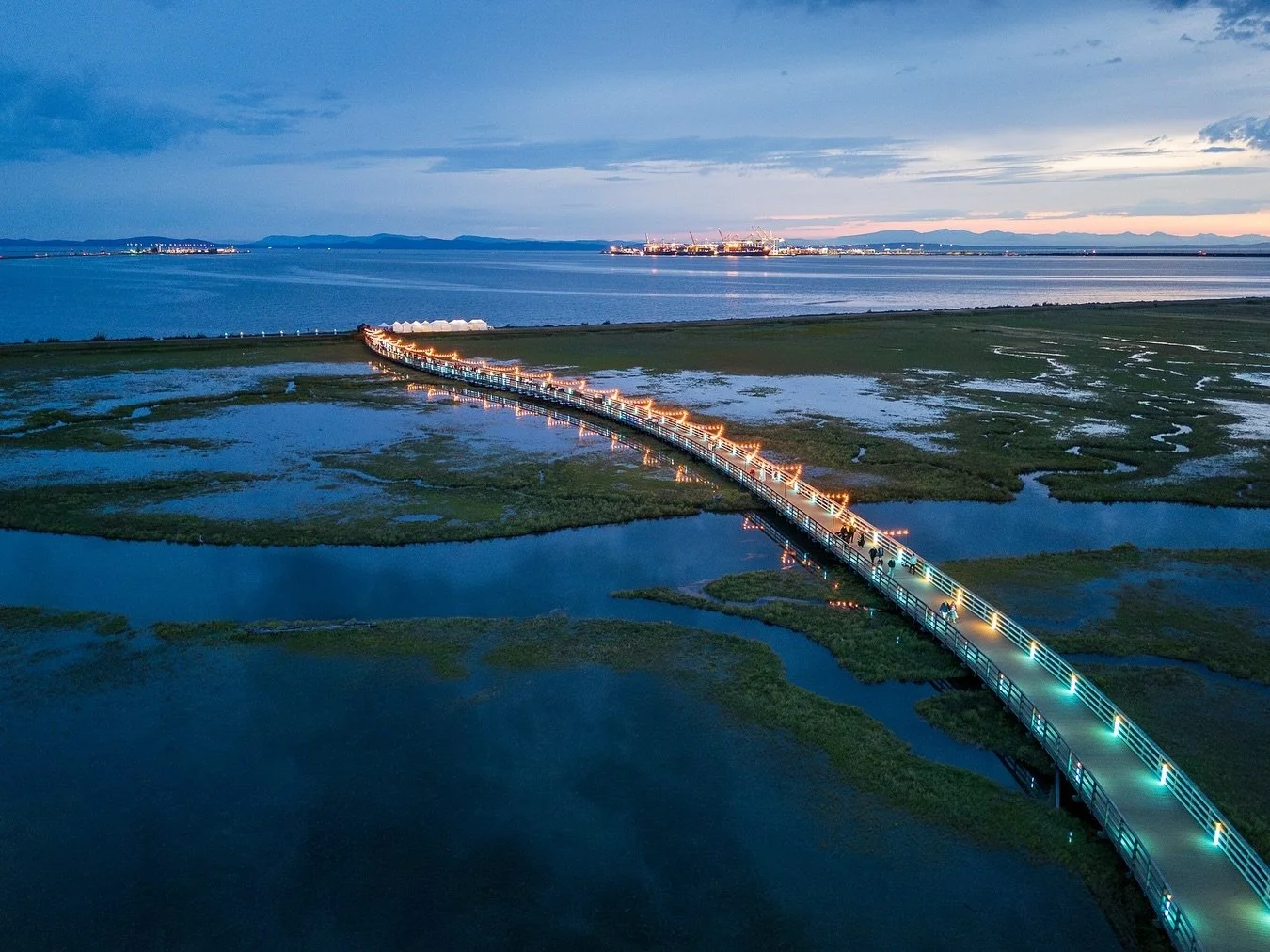 A large modern house with illuminated windows, a backyard with a swimming pool, patio furniture, lounge chairs, and lush landscaping at dusk.